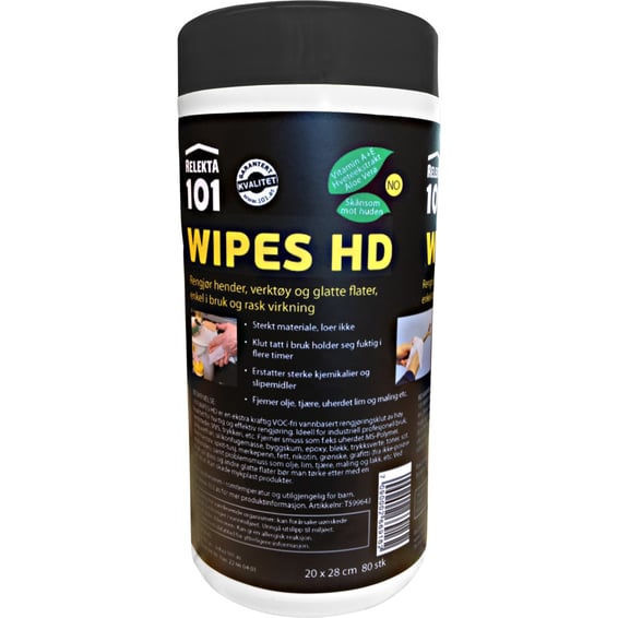 101 WIPES HD inneholder Aloe vera, hveteekstrakt og vitaminene E og A for å beskyttte huden ved bruk, er fri for VOC, og kan i mange tilfeller erstatte bruk av vann, såpe, harde kjemikalier og slipemidler.Bruksområde