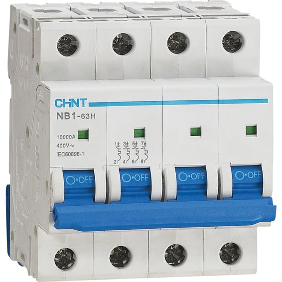 NB1-63H er Chint standard automatsikring med meget store anvendelsesområder. Den er godkjent med bryterevner etter EN 60898 og EN 60947-2, og benyttes i anlegg for sakkyndig og usakkyndig betjening. Leveres som 1P, 1P+N, 2P, 3P og 4P. Polbredde 18 mm. Merkestrøm (In): 0,5 - 63A. Utløserkurver ihht. EN 60898: B, C og D-kurve Bryteevne ihht. EN 60898: 10kA ved 230/400 V. Bryteevne ihht EN 60947-2: 30kA ved 230 V, 15kA ved 400 V, 10kA ved 440 V.