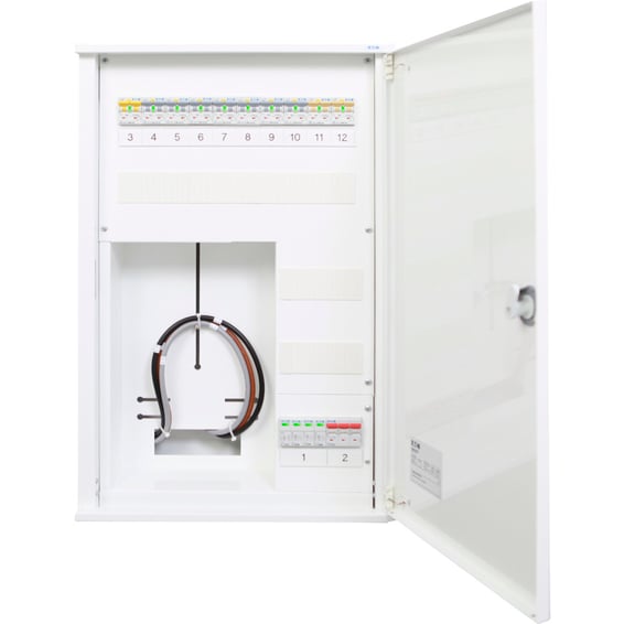 Komplett boligskap med overbelastningsvern, overspenningsvern og 14 kurser av typen xDigital jordfeilautomater. Valgfri dørhengsling