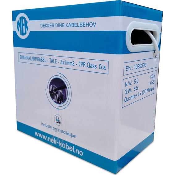 Konstruert for desentraliserte varslingsanlegg, innendørs montasje. Beregnet for byggverk i med virksomhet i risikoklasse 2 - 6. Støyskjermet signaloverføring til høyttalere og sirener. Leveres på praktiske sneller i boks 100 m eller på 500 m trommel. 1 mm² tverrsnitt kombinert med lavere vekt og ytterdimensjon gjør NEK Brannalarmkabel til det beste valg.Vi er etter Forskrift om elektrisk utstyr § 21 pliktig til å informere våre forbrukere at installasjonsmateriell ment for å kunne inngå i et fast elektrisk anlegg kan kun installeres av en registrert installasjonsvirksomhet. Unntatt er elektrisk materiell som utelukkende er ment for bruk i faste teleinstallasjoner, og elektrisk materiell som forbruker selv lovlig kan installere. Ønsker du mer informasjon, se ”Hva kan du gjøre selv?”, hvor du også finner ekstern lenke til dsb (Direktoratet for samfunnssikkerhet og beredskap) for “Hva kan privatpersoner gjøre selv på det elektriske anlegget?”