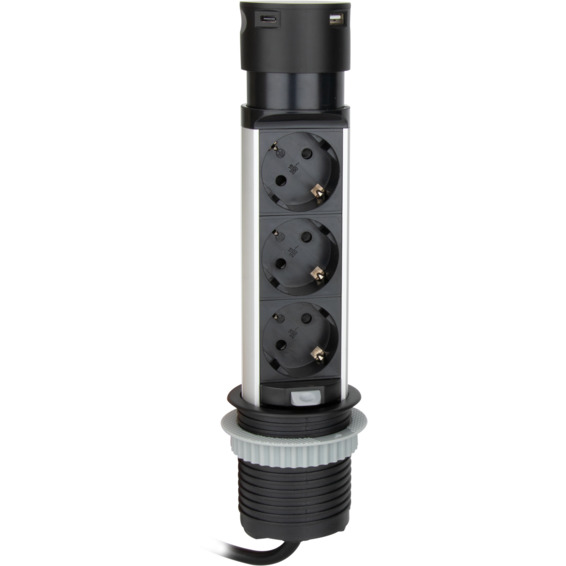 Høy strømsøyle for nedfelling i bord eller kjøkkenbenk. Uttrekkbar modul i aluminium med tre stikkontakter og to USB-porter (A+C).