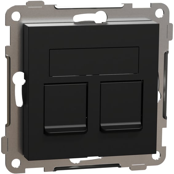 ELKO Sentralplate rett, universal for 1 eller 2x Keystone eller S-One. Kontaktene sneppes direkte inn i festerammen, og den medfølgende 2-hulls sentralplaten sneppes på plass. Hullbilde og innfesting er tilpasset både Keystone og S-One konnektorer. Monteres i 1- til 5-hulls ramme, innfelt eller i høy påveggskappe eller hjørnekappe. Leveres med støvdeksel og vendbart merkeskilt. Mål på produktet er (B) 74,2 mm x (H) 74,2 mm x (D) 23,5 mm. Kompletteres med design ramme. Kapslingsklasse IP20. Farge: sort.