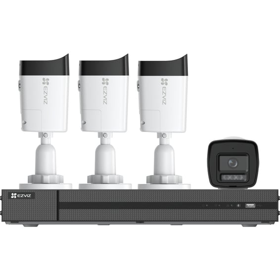 EZVIZ H3K-kameraene leverer 4K-video, H.265? komprimering og har en robust aluminiumsdesign med IP67-klassifisering. De støtter farge nattvisning, toveis lyd, aktiv forsvar (sirene + strobe), og AI-basert deteksjon av mennesker og kjøretøy. Kameraene kobles via PoE, og settet inkluderer fire 18-meters kabler.