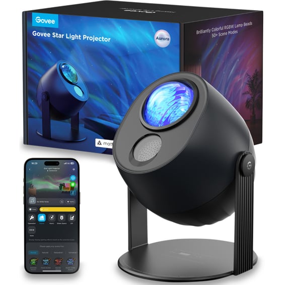 Govee Star Light Projector bruker en LED-lyskilde som projiserer realistiske stjernemønstre og galakseeffekter. Den har flere lysmoduser som kan styres via fjernkontroll, og den kan justeres for å passe ulike stemninger. Projektoren kan koples til stikkontakt og har justerbar fokus. Kompatibel med app for ekstra kontroll, avhengig av modell.