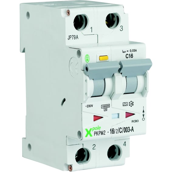 Xpole 15A jordfeilautomat PKPM tilpasset samme samleskinne som elementautomat PLSM. Rekkeklemme for tilkobling av 1-25 mm2 CU- kabel. Utløsergrense på 30 mA. B karakteristikk. Passer inn i IT/TT/TN anlegg.