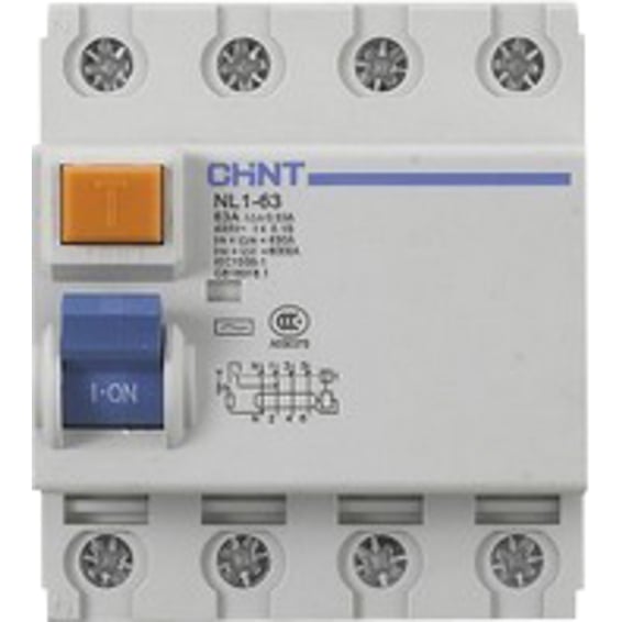 Jordfeilbryter Chint 4 polet Type A. 10 Ka. Tåler feilstrømmer opp til 500A. Tilkoblingsmoment: 2,5 Nm. Utløserstrøm i mA: 30mA. Poler: 4. Ampere: 63.