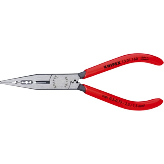 Den kombinerer flere funksjoner i ett verktøy: griping, bøying, kutting, avisolering og crimping. Presisjonsskjæret sikrer rene kutt, mens avisoleringshullene gir enkel fjerning av isolasjon uten skade på lederen.