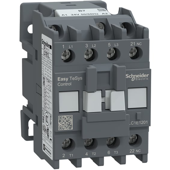 3-polet Easy TeSys kontaktor for motorstyring, nominell strøm opptil 12A og effekt opptil 5,5kW ved 440V Den er utstyrt med en 24V AC spole for 50/60Hz, har én innebygd normalt lukket (1NC) hjelpekontakt, samt effekt- og styrestrøms tilkoblinger via skruklemme terminaler. Bredde: 45 mm, tilpasset standard drift med opptil 1800 koblingssykluser per time. Produktet tilbyr pålitelig ytelse med en elektrisk levetid på opptil 1,4 millioner sykluser (AC-3) og en mekanisk levetid på opptil 10 millioner sykluser, noe som sikrer langvarig og robust drift i applikasjoner. Kontaktoren støtter drift i temperaturområdet -5 °C til 55 °C og er beregnet for montering på DIN-skinne. Ytelsen opprettholdes uten effektreduksjon i høyder opp til 3000 meter. Sertifisert i henhold til flere standarder (IEC, CCC, EAC) og i samsvar med krav (RoHS/REACH).
