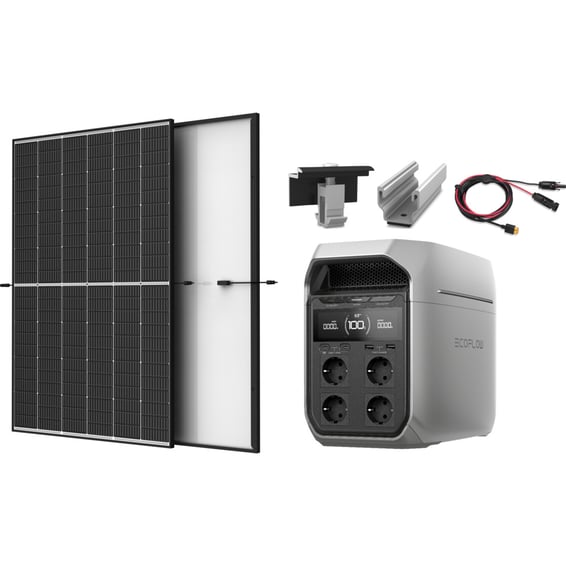 Systemet er basert på EcoFlow DELTA 3 PLUS, en bærbar strømstasjon med integrert LiFePO4-batteri på 1024Wh. Enheten leverer opptil 1800W kontinuerlig 230V effekt, med opptil 3600W startstrøm for apparater som krever høyere oppstartseffekt. EcoFlow DELTA 3 PLUS støtter solcellelading opptil 1000W via to MPPT-innganger, noe som gir svært effektiv utnyttelse av solenergi. I denne pakken leveres to Trina 425 W solcellepaneler som samlet kan produsere opptil 850W under optimale forhold. Panelene kobles til strømstasjonen via EcoFlow MC4 to XT60I Cable 5m, som sikrer kompatibel og effektiv tilkobling. Solcellepanelene monteres ved hjelp av K2 MultiRail 10 monteringsskinner og K2 Clamp 30–50 festeklemmer, som gir stabil og sikker installasjon. EcoFlow-enheten leverer standard 230V AC, i tillegg til flere uttak for USB-A, USB-C og 12V DC.
