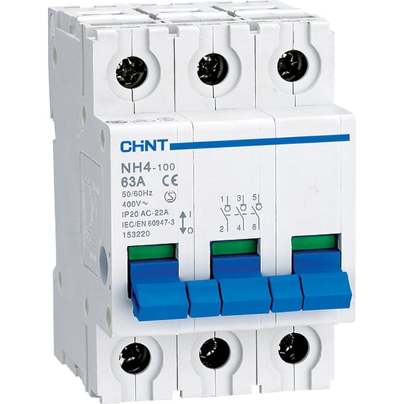 63A 3-Pol 3-Moduler med allpoligbrudd. terminalerne er utstyrt med captive Pozidriv skruer og har IP20 beskyttelsesgrad.Funksjonalitet
