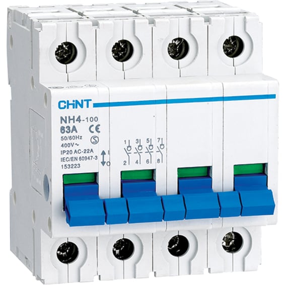 Lastbryter for montering på DIN-skinne med vippehendel, 4Pol/4mod, 125A. Driftstemperatur -5 til +40. IP20. Godkjent for 16mm2. Moment 2,5nm. Bildet er ment som illustrasjon.