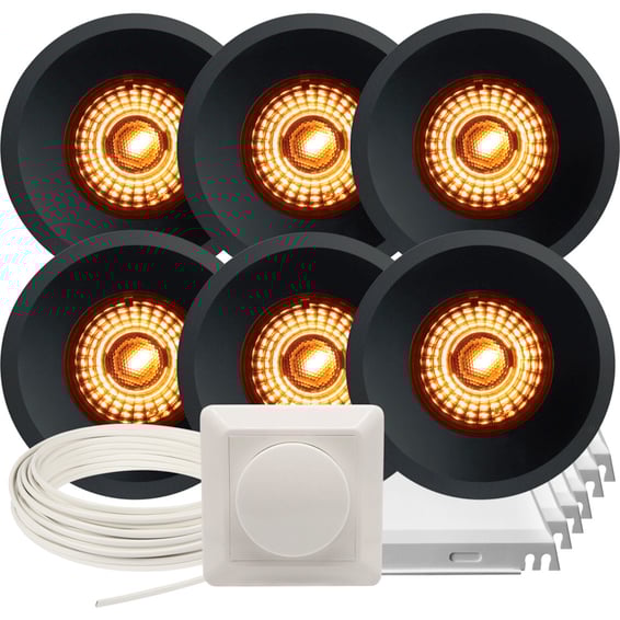 Komplett pakke med 6 downlights og nødvendig tilbehør for montering. Kan dimmes ned helt flimmerfritt med medfølgende dimmer.Downlighten har varmhvitt lys (2800-2000K), og en lysstyrke på 730 lm og RA- verdi på 97+, som gir meget god fargegjengivelse. WarmDim gir varmhvitt lys ved full styrke, og blir gradvis enda varmere når det dimmes -akkurat som vi er vant med fra halogenlamper. Perfekt for stue og andre oppholdsrom der man ønsker en lun og god stemning.