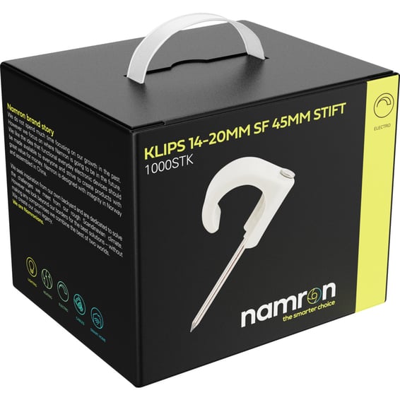 Namron klips 14–20 mm grå med 45 mm stift er en praktisk festeløsning for kabler og rør. Leveres i en solid bøtte med 1000 stk, som gjør det enkelt å holde orden og alltid ha tilstrekkelig antall tilgjengelig på installasjonsstedet. Klipsene er laget for å gi en sikker og varig festing i ulike underlag.