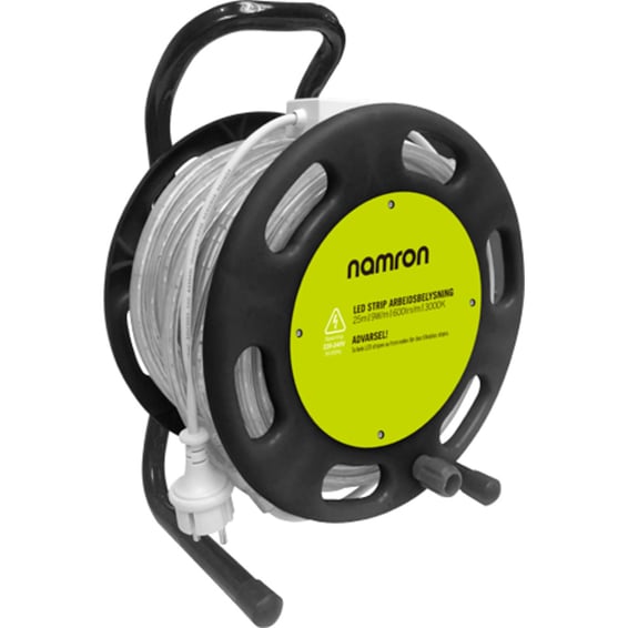 Namron LED-strip 25 meter på trommel. Dette fleksible arbeidslyset gir en jevn belysning og kan dimmes etter behov. Spesielt tilpasset for byggeindustrien og midlertidig belysning av arbeidsplassen. Perfekt til belysning av trapper, sjakter, korridorer og større rom. Ypperlig også for bruk på mørke loft. LED-stripen kan i tillegg brukes utendørs, som ledelys eller til å opplyse gjerder og gangveier.Funksjonalitet