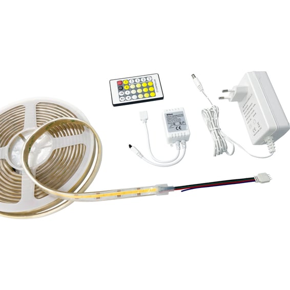 Namron LED-strip på 5 meter til innendørs og utendørs bruk. Leveres med IR fjernkontroll og 24V strømforsyning.