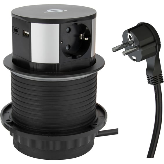 Uttrekkbar modul med tre stikkontakter og 2 USB-porter.Spenning: 230V~ 50Hz