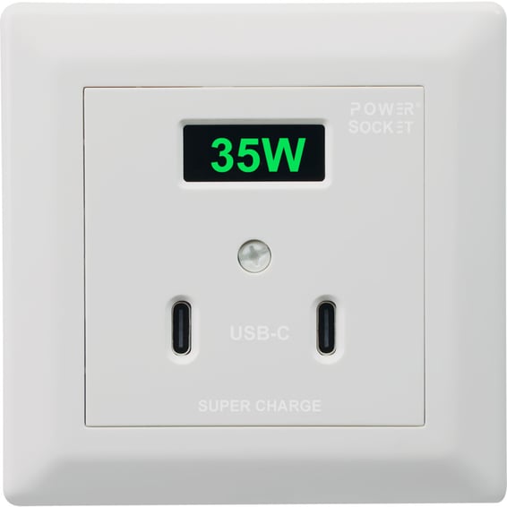 Powersocket tilkobles nettspenning (230V) og har 35W total ladeeffekt.Maksimal ladeeffekt pr utgang: