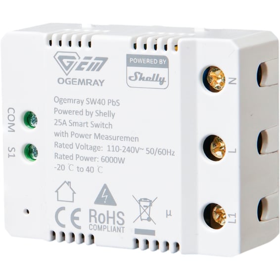 Reléet er utviklet for styring og energimåling av store enfasede laster på opptil 25A, noe som gjør det ideelt til kontroll av vannvarmere, pumper og andre kraftige apparater. Ogemray-reléet overvåker strømforbruket i sanntid og lagrer data i Shelly Cloud eller i din foretrukne tredjepartsplattform. Enheten kan også kobles direkte til et Modbus-system.