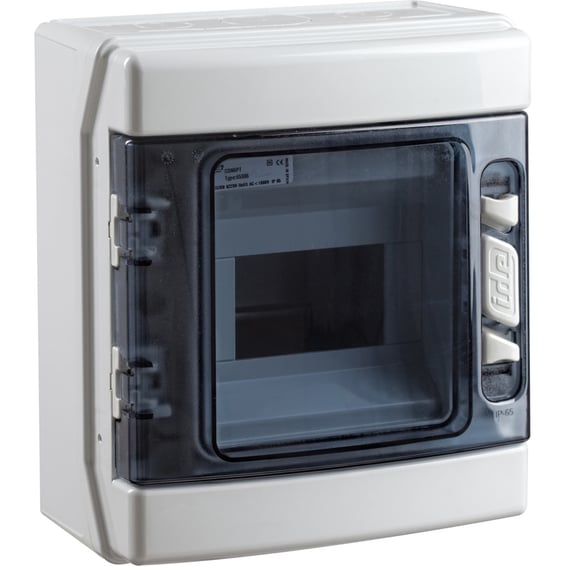 Påveggskap IP65 med transparent dør. Halogenfri. Beregnet for utendørs bruk. Utførelse i ABS.