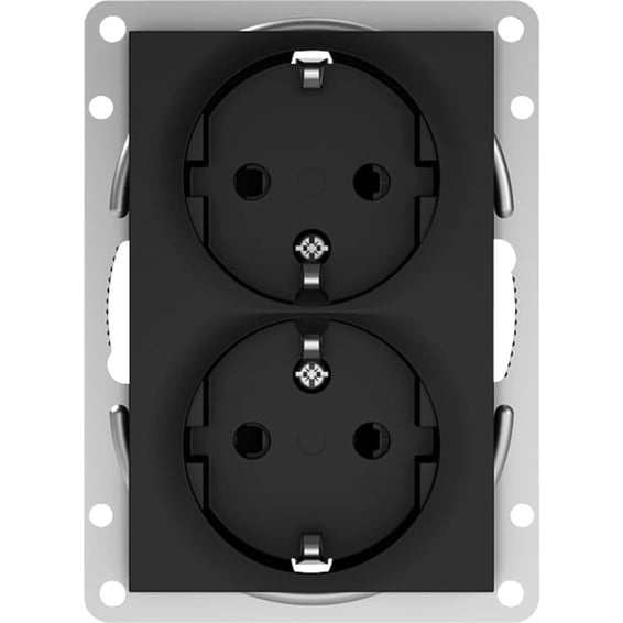 Sort, dobbel stikkontakt fra Elko's Plus-serie, for innfelling. Med jord og barnevern. Rammer selges separat, og kommer i fargene: frostet glass, sort sotet glass, stål og skifer.