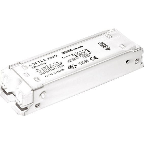 Reaktor for 1 stk 58 eller 65W lysrør. Magnetisk reaktor for T8/T12 lysrør.