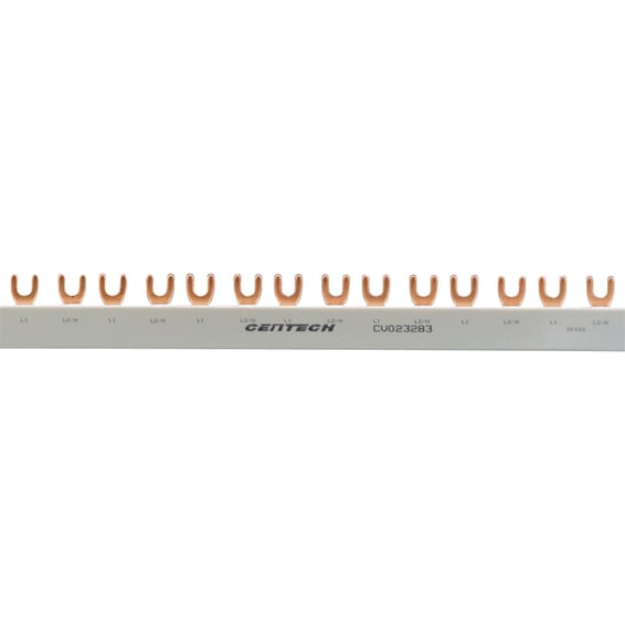 Samleskinne for 2-pol L1+N/L2 med gaffel som passer til jordfeilautometer 2-pol med 2 modulers bredde.