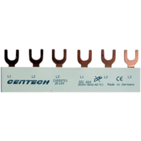 For lasking mellom overlastvern 3P og overspenningsvern 3P. Kan også brukes til å koble sammen 2 stk 3P 3moduls modulære vern. L1-L2-L3-L1-L2-L3.Relevante emneord