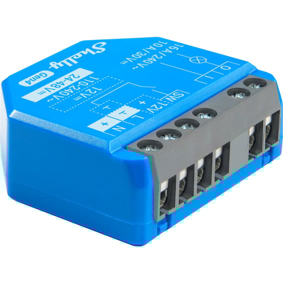 Shelly 1 Gen4 har mange anvendelser. Den kan forsynes med 12V DC, 24–48V DC eller 110–240V AC. Det potensialfrie reléet gjør det mulig å styre garasjeporter, SG-Ready-varmepumper, vanningsanlegg og mye mer. Enheten har én bryterinngang som er valgfri å bruke og fullt programmerbar.