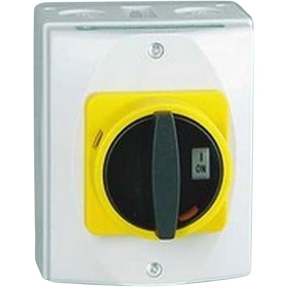 Sikkerhetsbryterne 32A 3-pol+1. Kapslingen er i polykarbonat med 2 stk. kabelinnføringer opp og ned. Lokket er låsbart i 0-stilling med inntil 3 hengelåser. Leveres med hjelpekontakt. BxHxD: 110x145x70 mm. IP54.