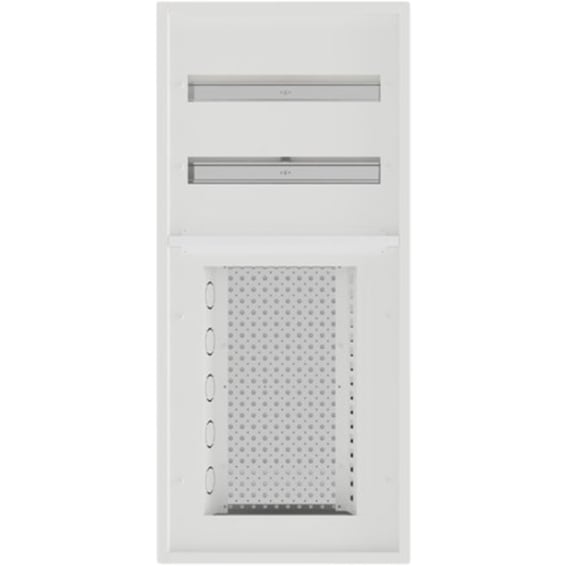 Fordelingsskap 2 rader, med svakstrømsfelt under, TN-nett 230V. Leveres med 2x63A overbelastningsvern og 8 jordfeilautomater. 1 stk. 25A og 7 stk. 15A. Samleskinner, lasker, avdekking, og gravert merking medfølger. Svakstrømsfelt leveres med KEYSTONE patchepanel, samt utsparing for innfelt Shucko stikk (50x50mm). Kapslingsgrad IP2XC.