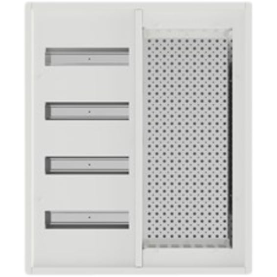 Fordelingsskap 4 rader, med svakstrømsfelt på siden, IT-nett 230V. Leveres med 2x63A overbelastningsvern og 10 jordfeilautomater. 1 stk. 25A og 9 stk. 15A. Samleskinner, lasker, avdekking, og gravert merking medfølger. Svakstrømsfelt leveres med KEYSTONE patchepanel, samt utsparing for innfelt Shucko stikk (50x50mm). Kapslingsgrad IP2XC.