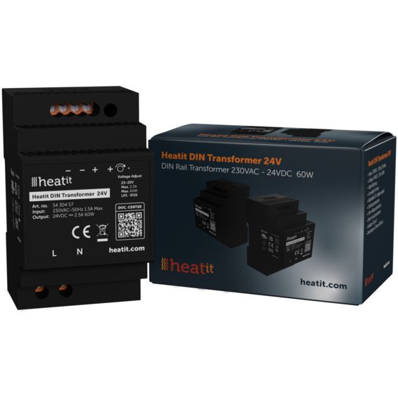 Transformator for montering på DIN-skinne. Kan brukes med Heatit Z-Water2 regulator.