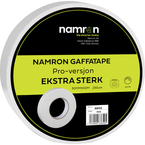 Hvit gaffatape/lerretstape fra Namron. Ekstra sterk og holdbar allround- tape med mange forskjellige bruksområder. Perfekt til for eksempel midlertidig festing av kabler, tetning og skjøting, eller til små reparasjoner. Bredde 30 mm, lengde 50 m.