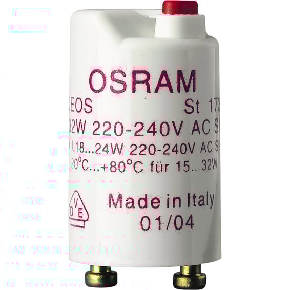 Deos Safty Tennere, Osram Deos sikringstennere for lysrør. Singelkoblet er til 1-rør kobling (1. rør pr. drossel) Betegnelse:Tenner ST 173 15-32W Normalpakning:25