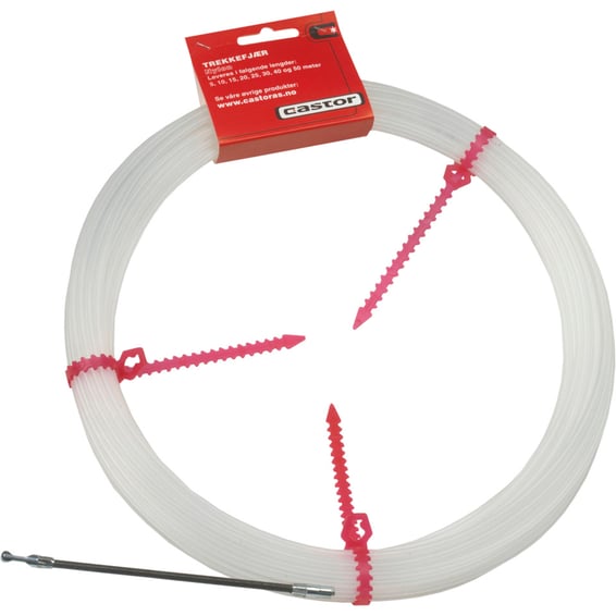 Nylon trekkefjæren med søkerspiral i metall er designet for effektiv trekking av kabler gjennom rør. Med en lengde på 10 meter, tilbyr denne fjæren en optimal balanse mellom rekkevidde og håndterbarhet for en rekke installasjonsoppgaver.