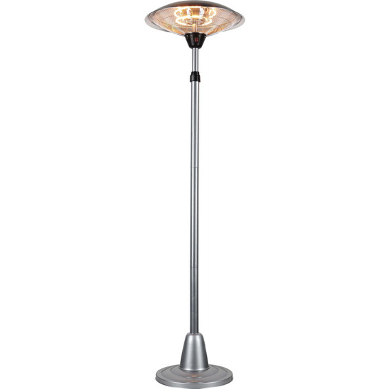 Gulvstående terrassevarmer på 2000W. Denne stilige terrassevarmeren i sølv tilfører uteplassen din det lille ekstra – både med tanke på komfort og design. Med halogen varmeelement og kortbølgede stråler varmer den raskt opp objekter i nær avstand, og varmen oppleves som både effektiv og behagelig - uten å være for intens. Høyderegulering og to-trinns justering (1000W og 2000W) gir ytterligere komfort.