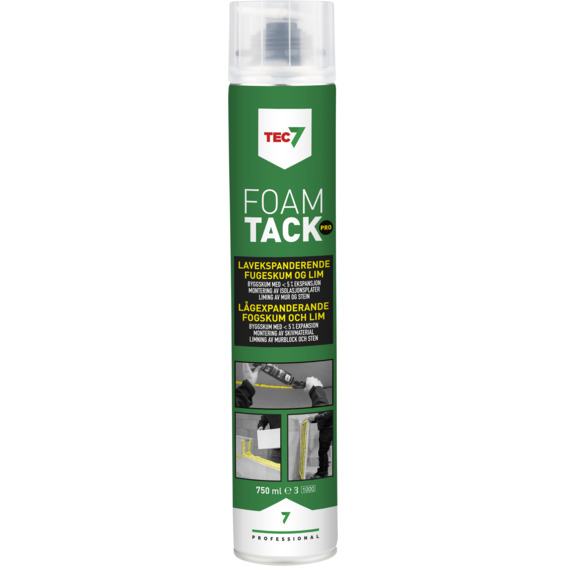 Skumlim for rask og effektiv liming av murblokker og gips-, isopor- og panelplater, som også brukes på byggematerialer som murstein, naturstein, trelister m.m. En boks FOAMTACK forenkler monteringsarbeid da den erstatter opptil 25 kg med tørrbetong. Den er et naturlig førstevalg når arbeidstid, herdetid, holdbarhet og isolasjonsevne er viktige faktorer, samt kriterer for godt inneklima da FOAMTACK tilfredsstiller emisjonskravene til BREEAM-NOR. Den kan belastes og bearbeides etter 30 minutter (60 minutter anbefales ved tung belastning).