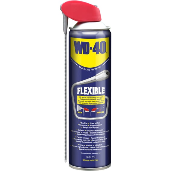 WD-40 Multispray Flexible beskytter metall mot korrosjon, trenger raskt inn og løsner fastrustede deler, driver ut fukt og smører nesten alt. Den fjerner også fett, og og smuss fra overflater.Forbehold