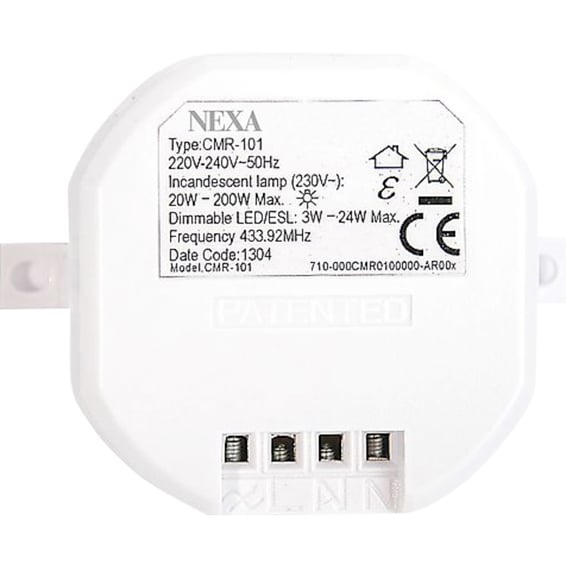 CMR-101 er en 230V trådløs dimmer for innfelling, med støtte for dimbare laster som LED (3–24 W), halogen og lavvolt transformatorer opptil 200 W, og CFL/ESL opptil 50 W. Den har lavt strømforbruk i standby (<1 W), drift via 433,92 MHz og beskyttet justeringshjul for innstilling av laveste dimmenivå.